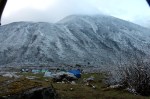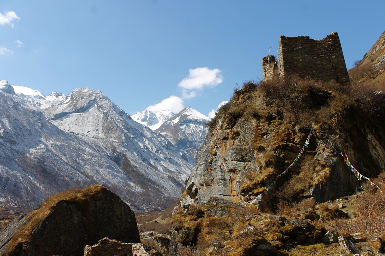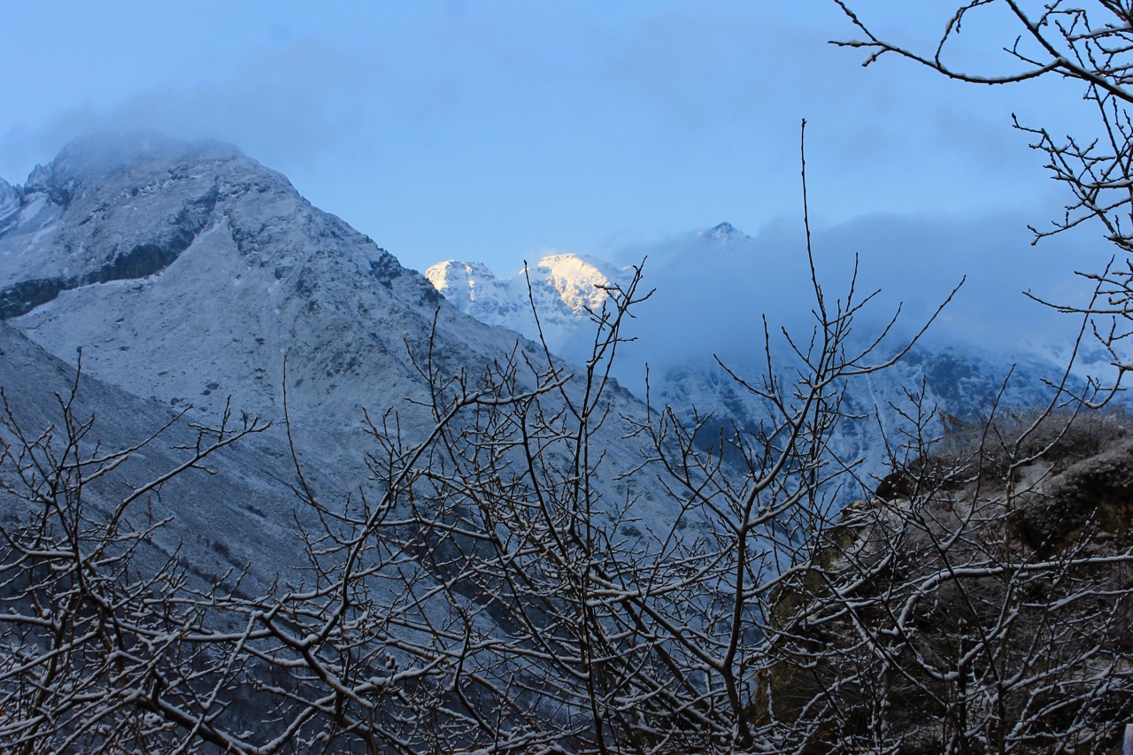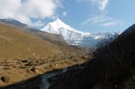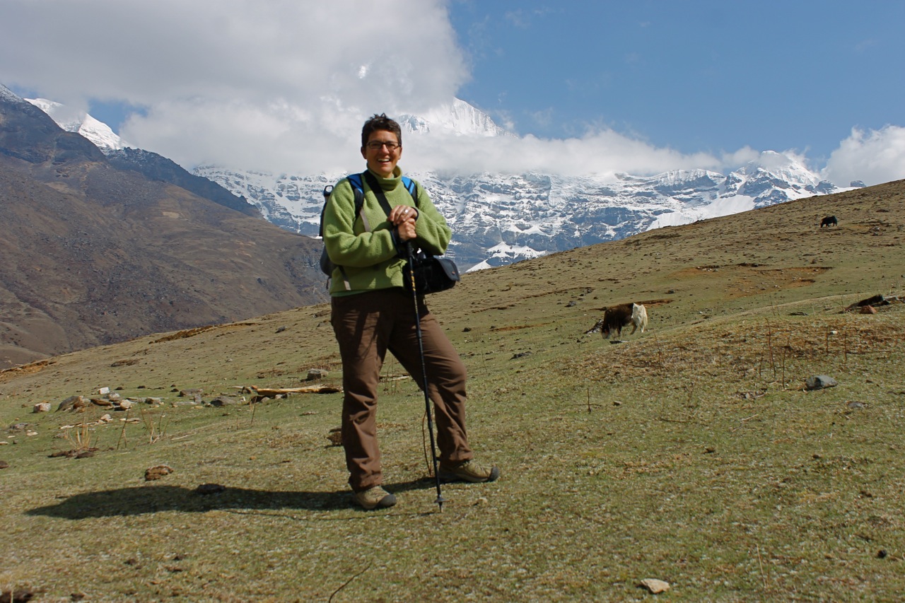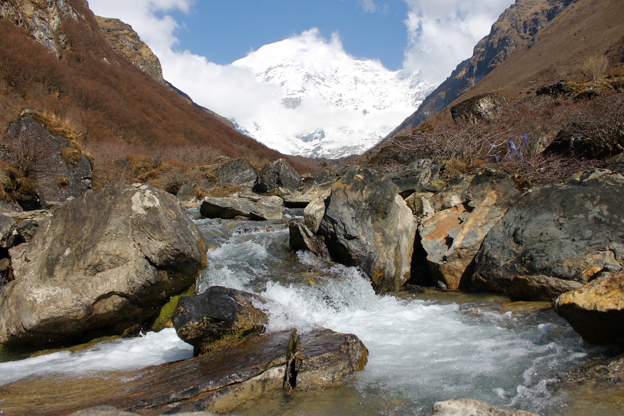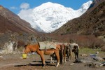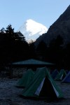 Three days of walking beside the roaring Pa Chu, among rhododendron woods, dodging the yak-trains trudging up the trails with their bells ringing and their breath steaming in the cool morning air, brought us to the base camp of Jangothang, the magnificent snow-covered Jolmolhari looming over us, and all the other trekkers whose tents were scattered over the valley floor.