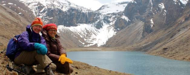 The rest of that glorious day, we walked along the steep shale slopes beside two deep turquoise high alpine lakes above Jangothang (14,500 feet), gazing upon herds of blue sheep and watching a pair of ruddy shell ducks as they made their journey to their summer home in the waters below.